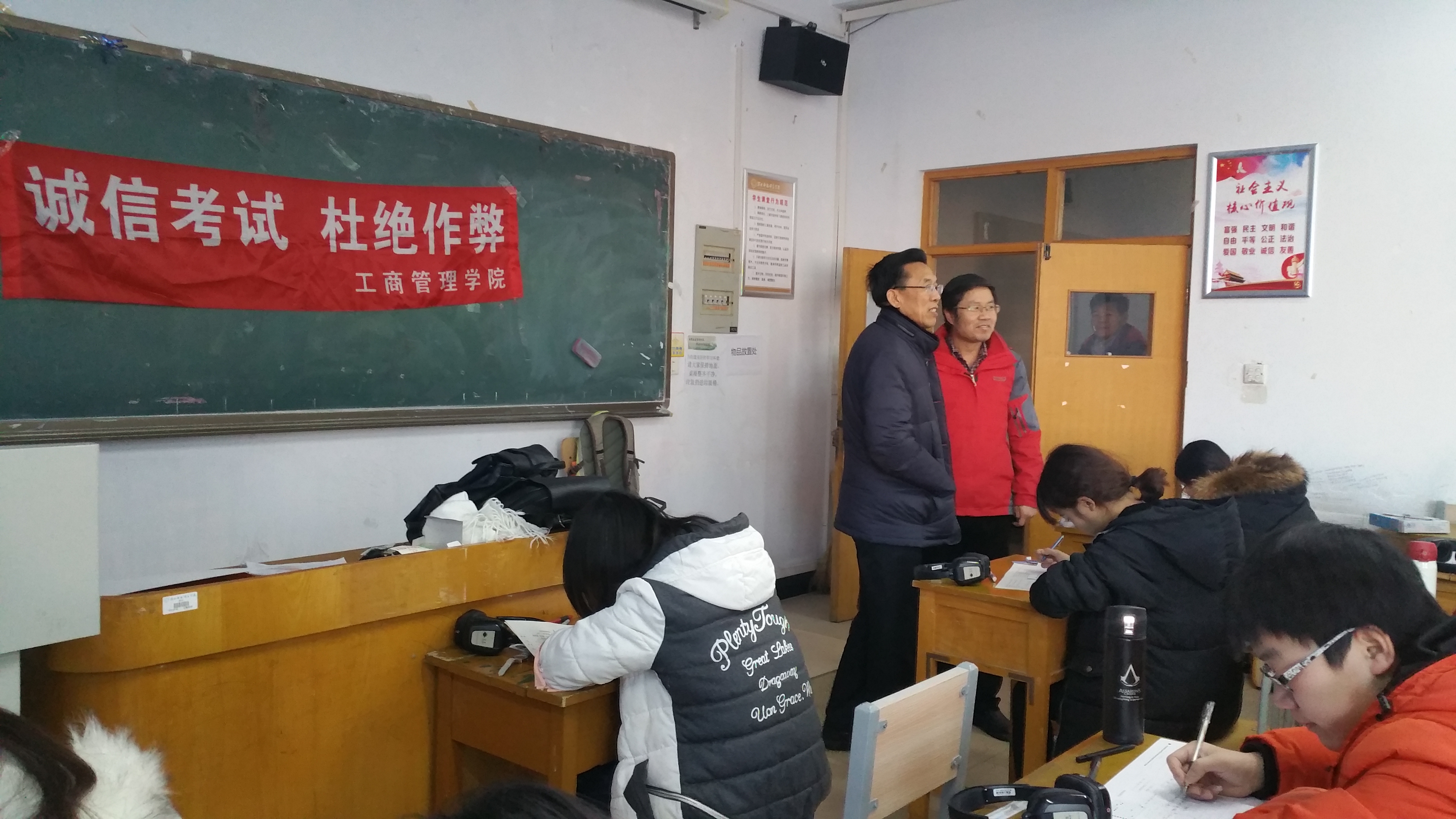 2018年1月10日是十大买球的正规网站期末考试第一天,共有10个 “无人监考”诚信考场,各班级在考场悬挂“诚信考试,杜绝作弊”条幅,全体同学承诺诚信考试并认真考试。