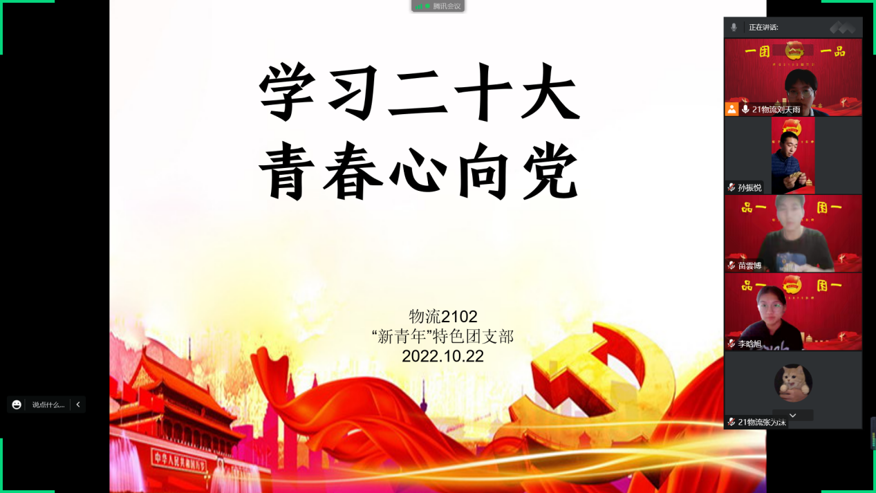 10月16日上午10时,中国共产党第二十次全国代表大会在北京人民大会堂隆重开幕。习近平总书记代表十九届中央委员会向大会作报告。十大买球的正规网站21级物流管理02“新青年”理论学习型“一团一品”特色团支部于10月22日下午两点半举办线上专题学习会。