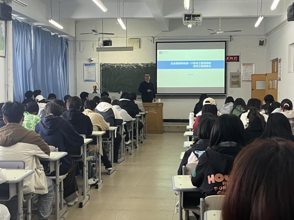 在讲座过程中,贾总经理通过诙谐生动的语言、图文并茂的幻灯片、丰富翔实的案例给大家呈现了软件工程项目的论证规划、分析设计、开发实施及售后运维等全生命周期的各个环节中细节及要点,学生们反响热烈,纷纷反映获益良多