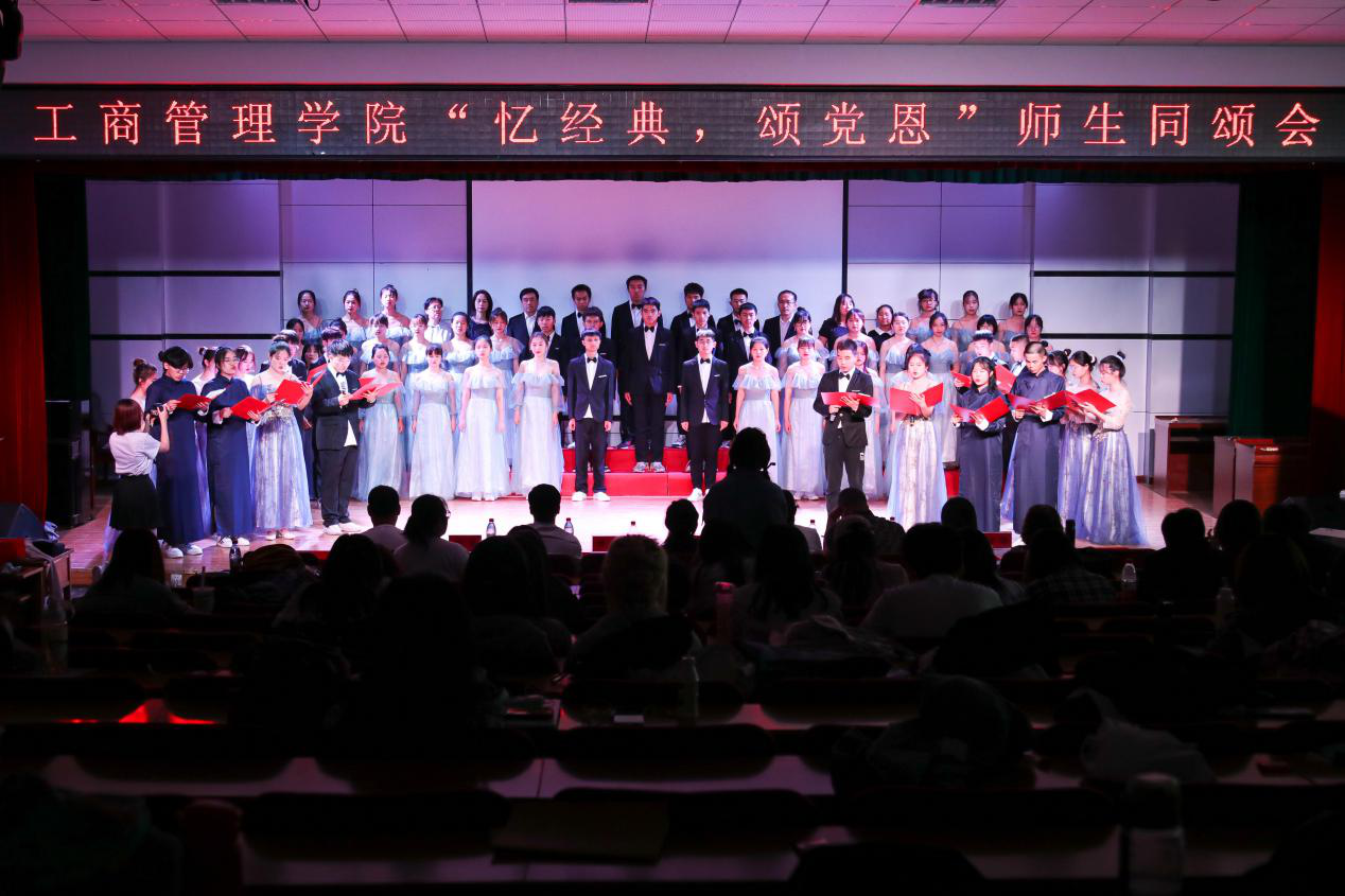 同颂会开场的诗朗诵《建党百年颂》铿锵有力、细数中国从觉醒到富强的百年历程,展现了不同时期共产党人的初心使命和责任担当。紧接着学院全体教师表演唱《没有共产党就没有新中国》和《中国》,展现了昂扬的精神状态和较高的演唱水平,引领同学们在激昂的旋律中回顾党的伟大历程,激发奋进力量。随后,各专业和相关教学部师生组成表演团队,精心设计,精彩演绎了规定曲目《岁月征程》和自选曲目《中国》、《我们都是追梦人》、《骄傲的少年》、《大中国》、《少年》等,歌颂了中国共产党领导下,中国的革命建设历程和改革发展成就,展现了工商师生理想坚定、奋发图强、勇于拼搏的勇气和决心;最后,学生党支部党员们饱含深情地表演了舞台剧《红梅赞》,引发精神与信仰的思考。同颂会在《歌唱祖国》的合唱声中结束,师生挥动着手中的五星红旗共同祝愿伟大的祖国繁荣富强,为党的百年华诞献礼!歌声嘹亮,余音绕梁,现场气氛再次被推向高潮。