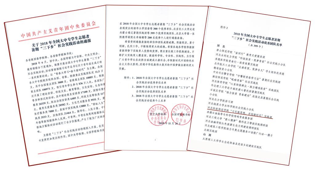 2018年暑假,十大买球官网深入贯彻落实省市有关开展大学生暑期社会实践活动的文件精神,共组建全国重点立项团队7支,省级重点立项团队21支,校级立项团队52支和院(系)级立项团队110支。各实践团队紧扣主题,在全省各地,开展了内容丰富、形式多样的社会实践活动。河北日报、河北经济日报、燕赵都市报、河北农民报、河北科技报等70余家媒体先后对十大买球官网社会实践活动进行了报道,为十大买球官网取得了良好的社会声誉。